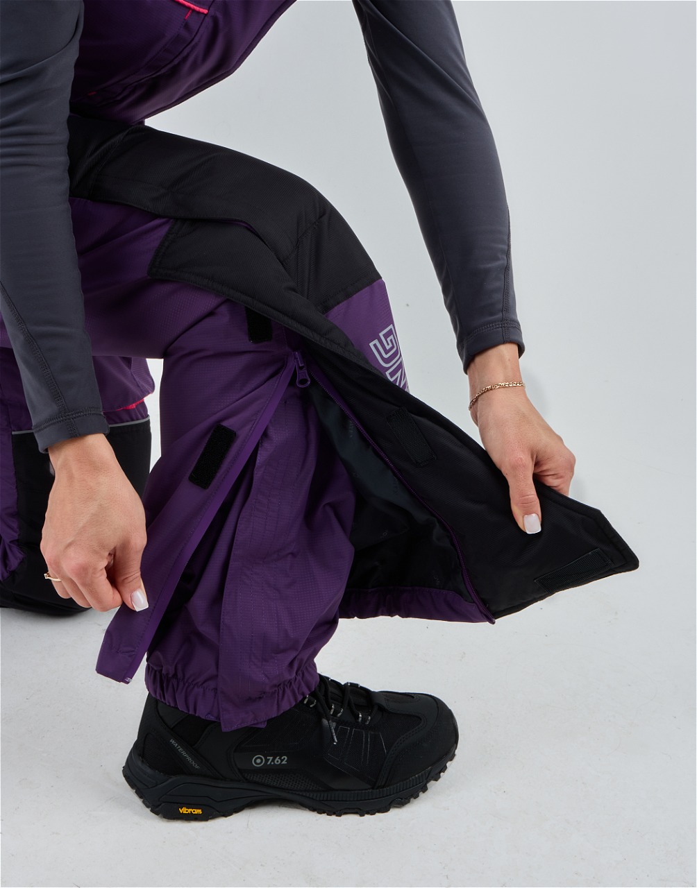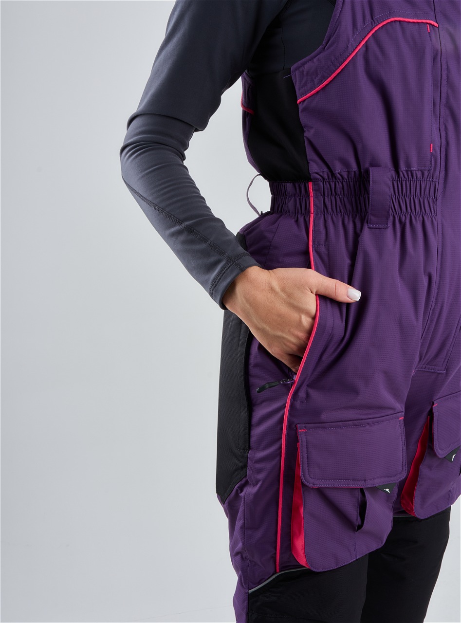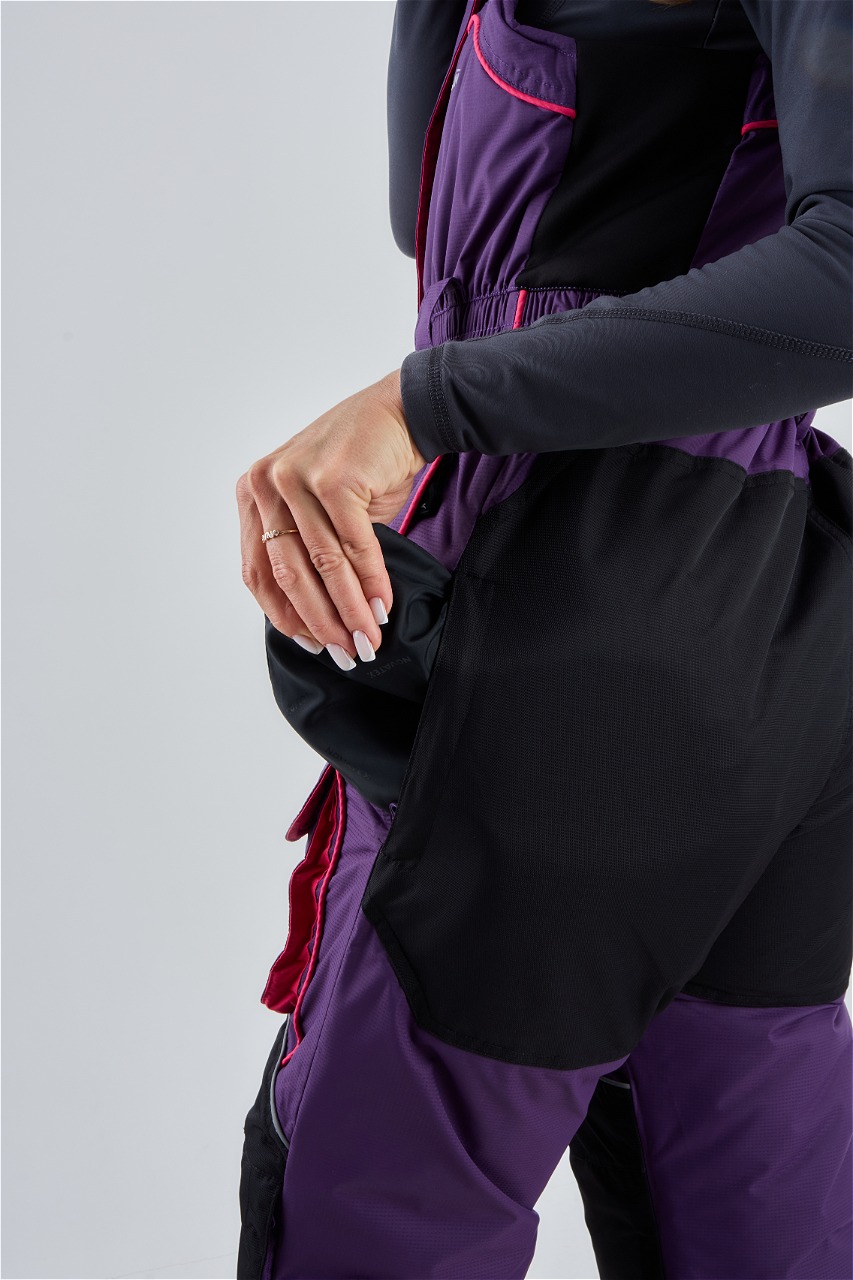 Брюки костюма имеют регулируемые лямки, что обеспечивает комфортабельную посадку и свободу движений. Низ брюк утягивается резинками, что предотвращает их задирание и обеспечивает дополнительную защиту от холодного воздуха и снега.
